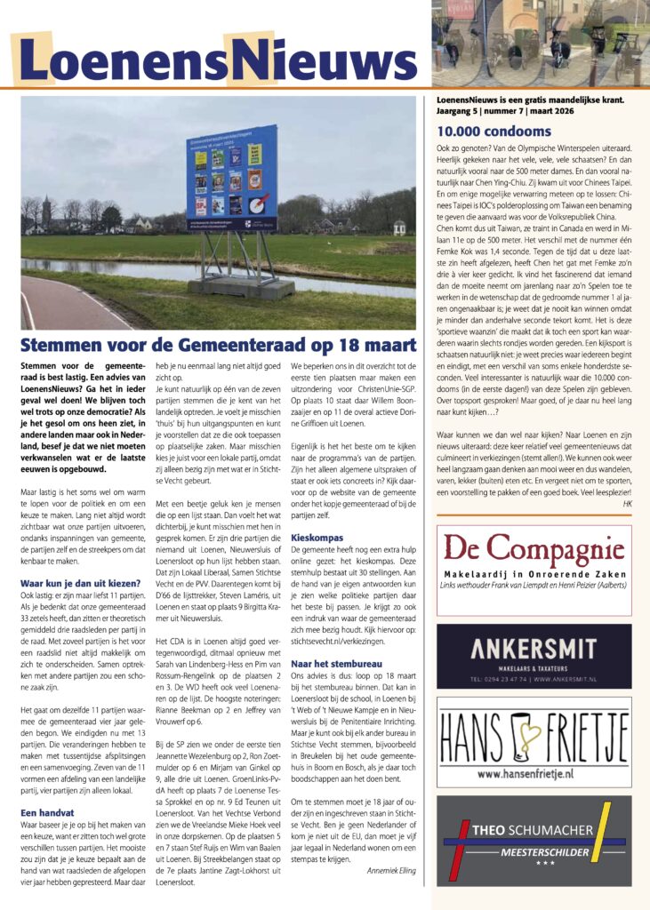 Met een beetje geluk ken je mensen die op een lijst staan. Dan voelt het wat dichterbij, je kunt misschien met hen in gesprek komen. Er zijn drie partijen die niemand uit Loenen, Nieuwersluis of Loenersloot op hun lijst hebben staan. Dat zijn Lokaal Liberaal, Samen Stichtse Vecht en de PVV. Daarentegen komt bij D’66 de lijsttrekker, Steven Laméris, uit Loenen en staat op plaats 9 Birgitta Kramer uit Nieuwersluis.